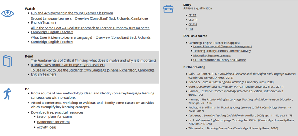 Because the suggestions are grouped according to development stages, as an academic manager I can use these to offer personalised PD to each of my teachers regardless of experience, on the same topic. And because the material is all online, teachers can access it at a time that is convenient to them, rather than having to try to get all the teachers in the same place at the same time on the same day.